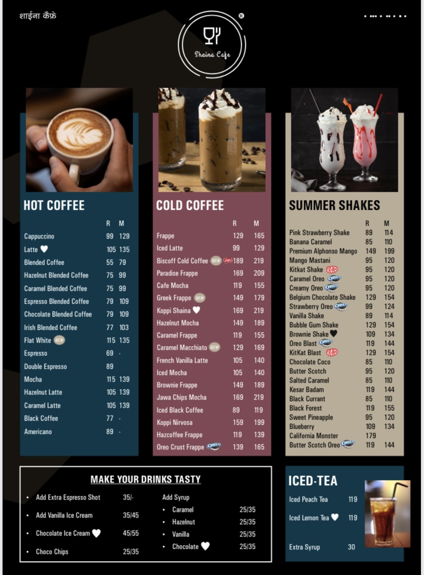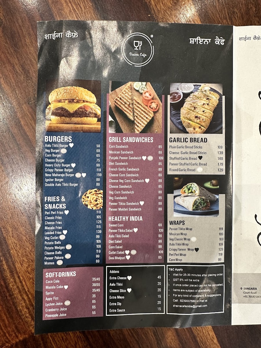 Shaina Cafe boasts a diverse menu that caters to a variety of tastes and dietary preferences. For those who lean towards healthy options, the Paneer Tikka Salad and Aalu Tikki Salad tantalize with fresh ingredients bursting with flavor. Priced at just ₹109 and ₹99 respectively, these dishes not only nourish but gratify with every bite.